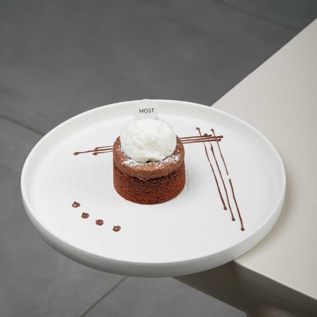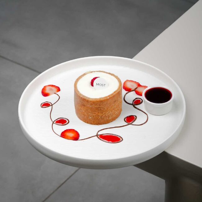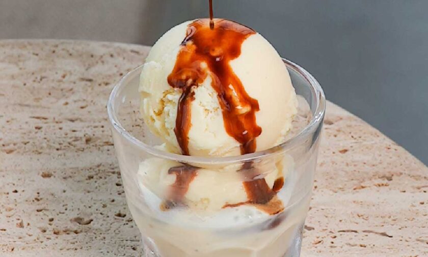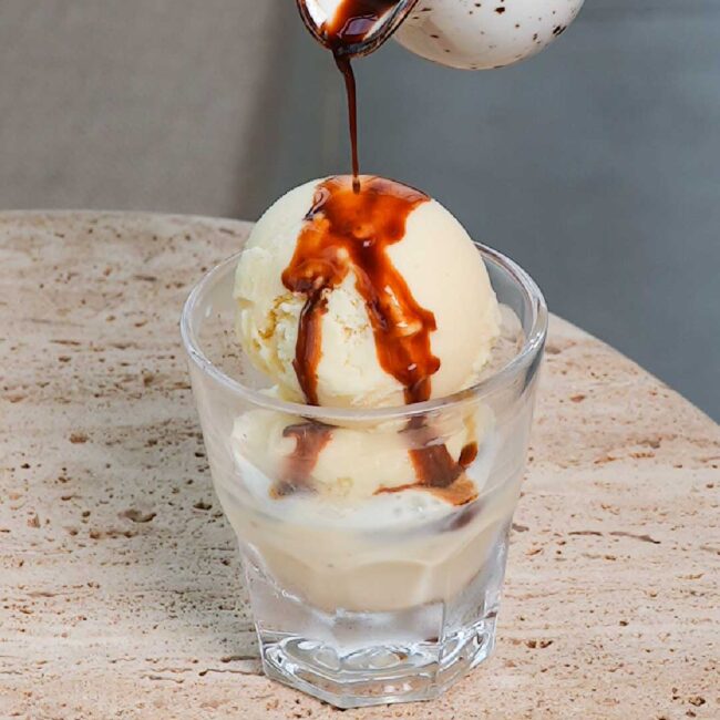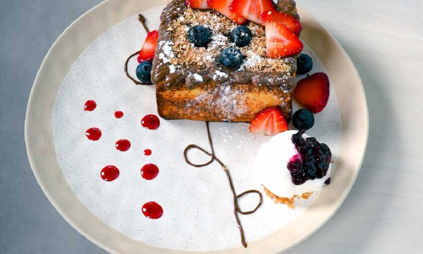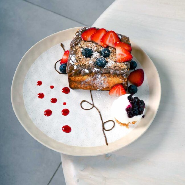 Brioche sliced, drenched and caramelised toast with nutella berries caramel and vanilla icecream.