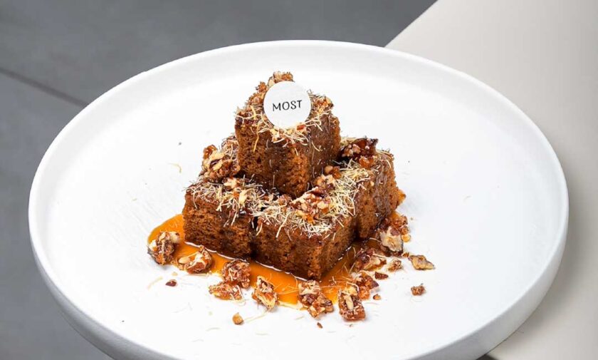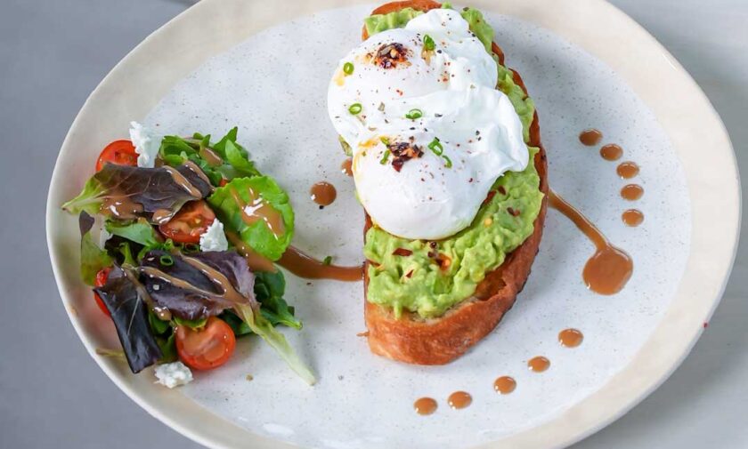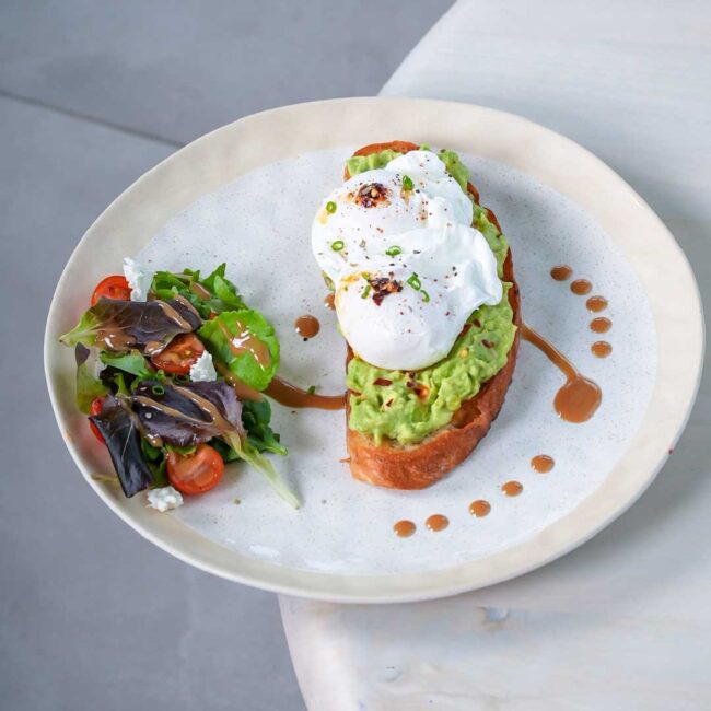 smashed avocado with Chimi Chur feta cheese and Dhukka spice served with poached eggs and Sakura.