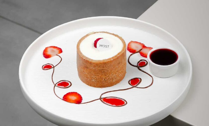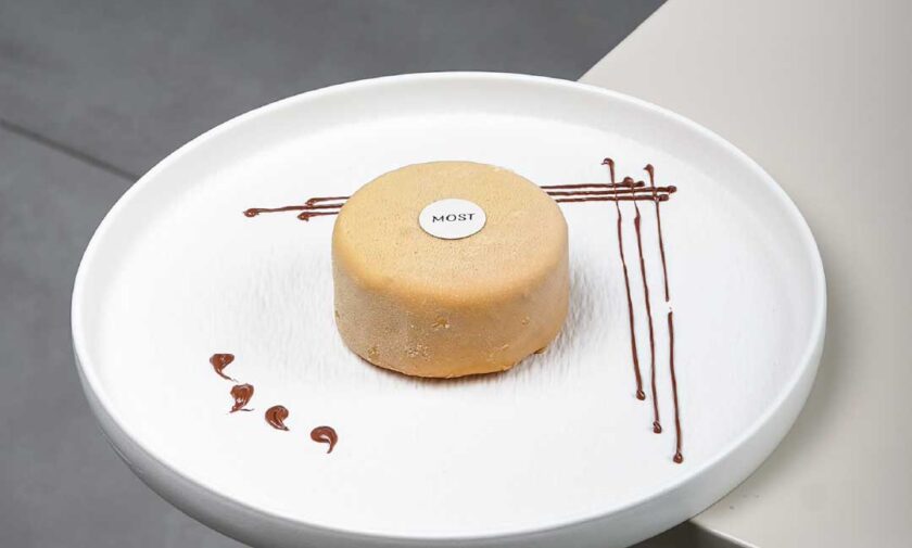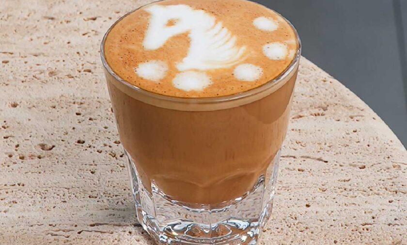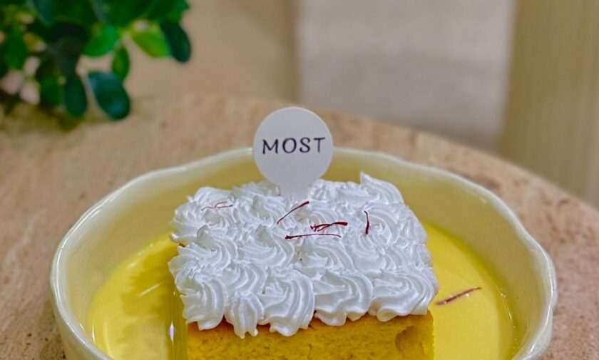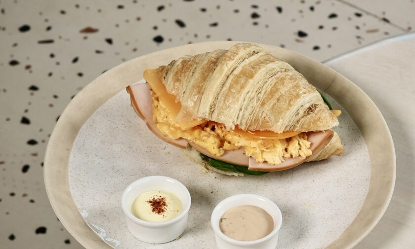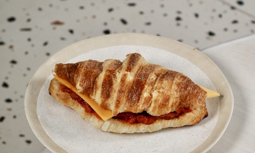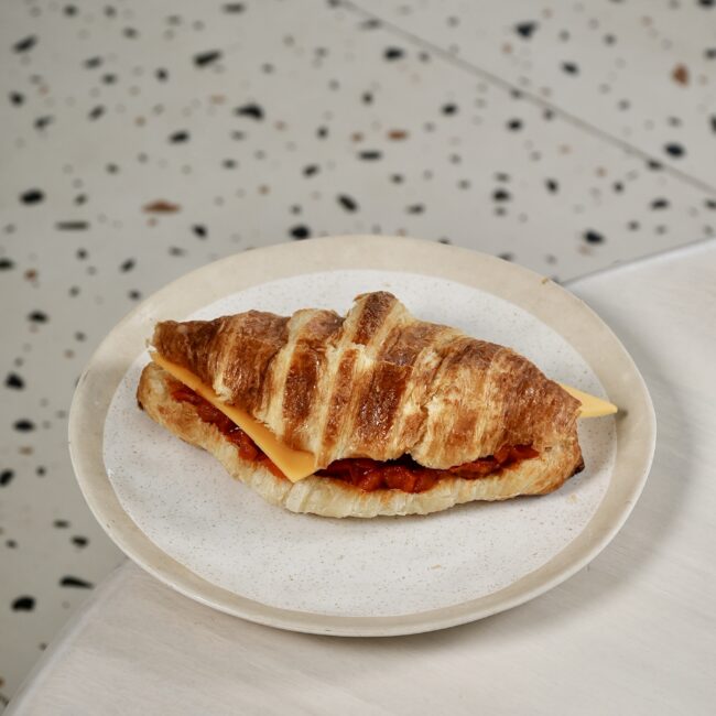 combines a flaky croissant with savory, cheesy shakshuka base, tomatoes and spices