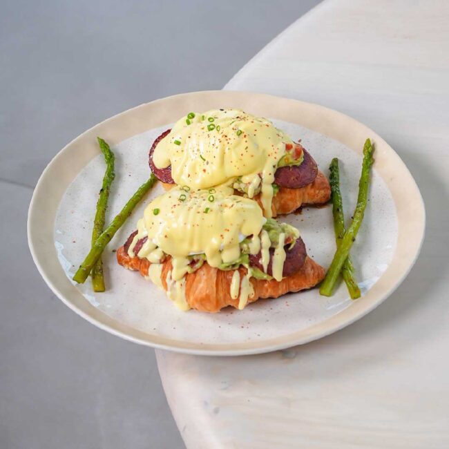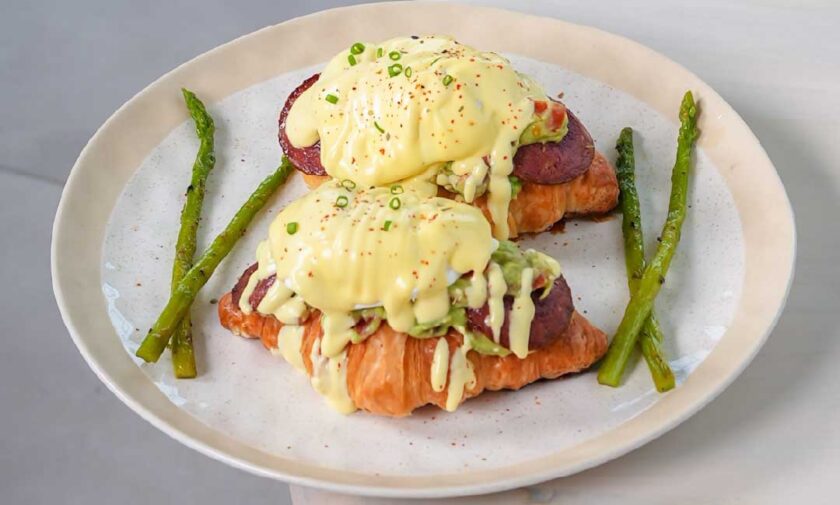 Flaky croissant topped on guacamole beef bacon asparagus poached eggs with hollandaise sauce.
