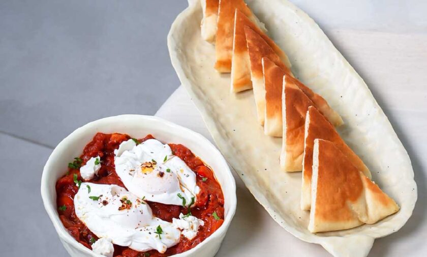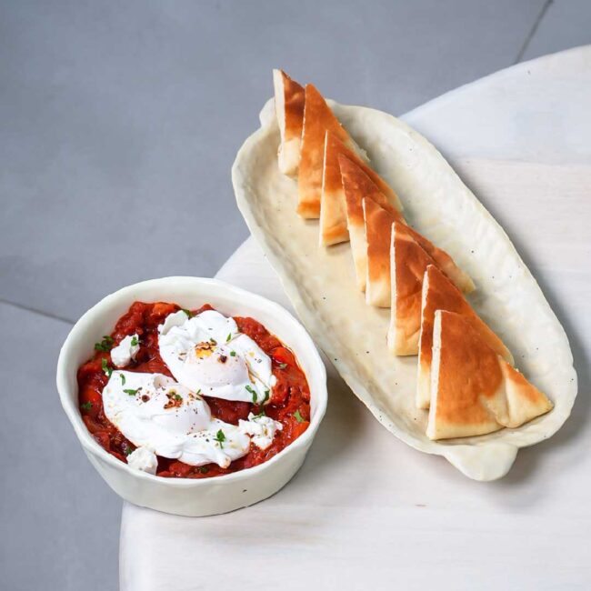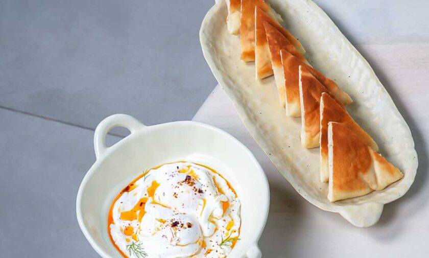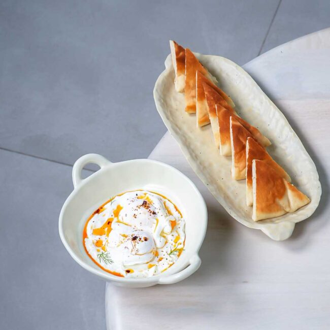 Greek yoghurt curved with chilli garlic served with poached eggs and pita bread.