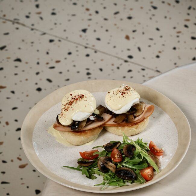 turkey and ham sliders typically include sliced turkey and ham, mushroom sauce with poached egg, special sauce and spices.
